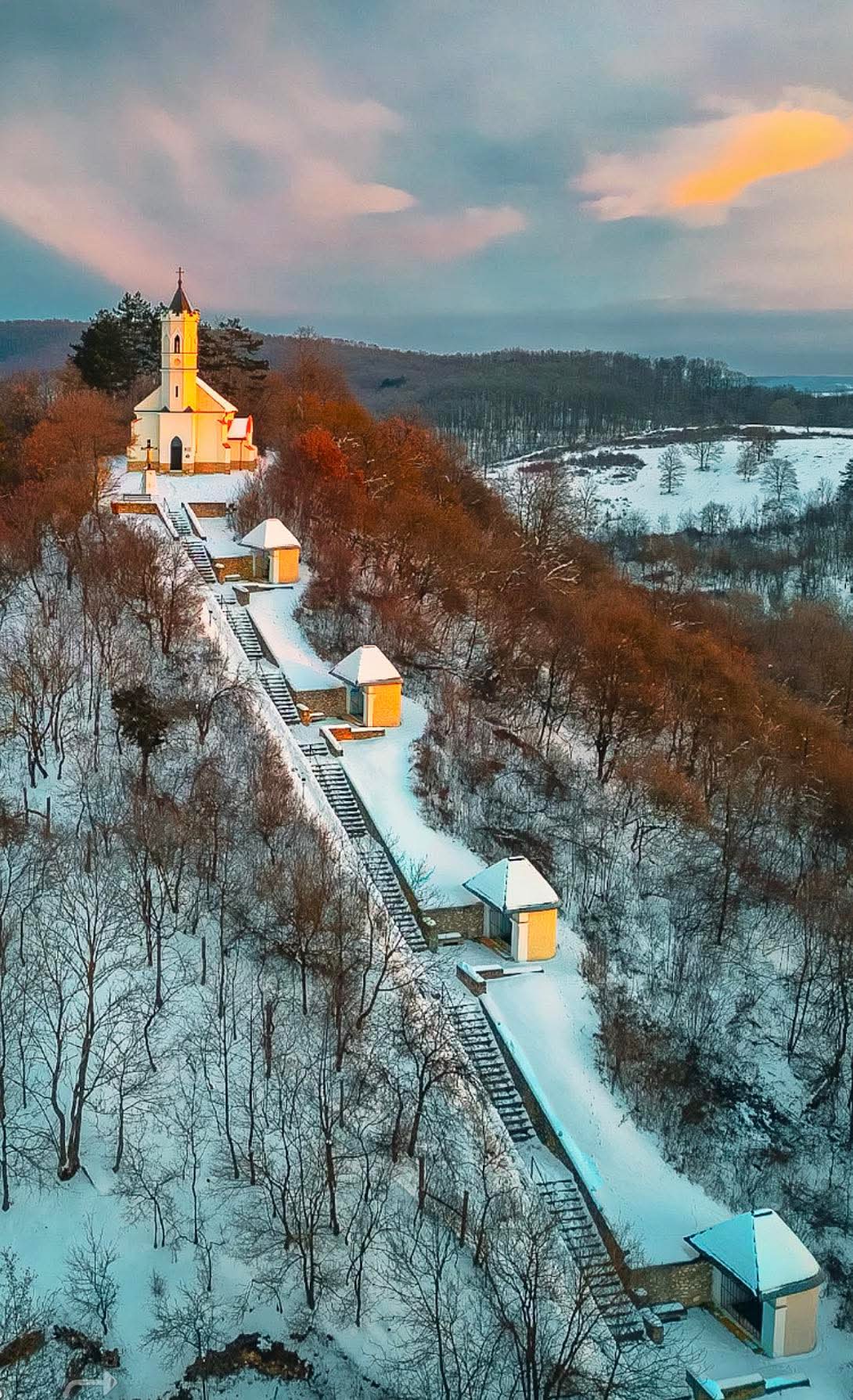 A kálváriaút és a kpolna a 19. századi népi vallásosság jellegzetes emléke. A stációk nem monumentalitásukkal, hanem arányosságukkal és a képen is – különösen erős a helyi szimbolikája: a hóval borított domboldal, a csönd és a felfelé vezető út egyszerre idéz elcsendesedést, emlékezést és történelmi folytonosságot.