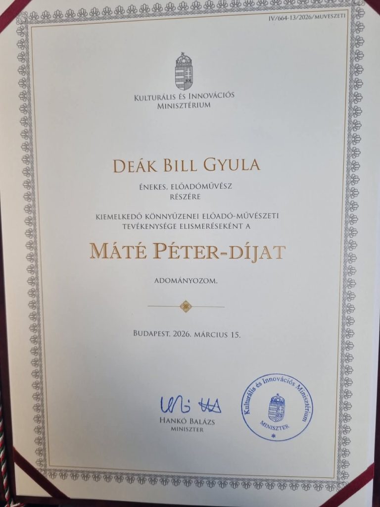 Deák Bill Gyula átvehette a Máté Péter-díjat. Bill kapitány megérdemelte ezt a díjat, a magyar blues zene koronázatlan királya, akinek az értékrendje nem változott és mindig éreztette a rajongók felé a szeretetét, és a tiszteletét.